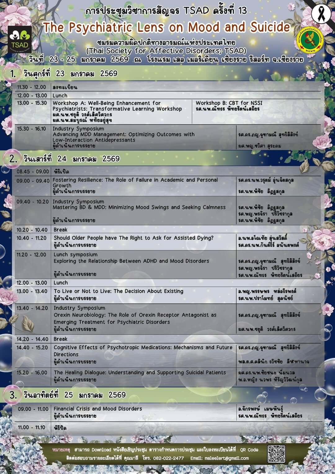 ชมรมจิตเวชศาสตร์อารมณ์แห่งประเทศไทย (Thai Society for Affective Disorders: TSAD) ขอเชิญสมาชิกและผู้สนใจเข้าร่วม การประชุมวิชาการสัญจร TSAD ครั้งที่ 13 ภายใต้แนวคิด The Psychiatric Lens on Mood and Suicide ถ่ายทอดองค์ความรู้ด้านอารมณ์และการป้องกันการฆ่าตัวตาย ผ่านมุมมองทางจิตเวชศาสตร์อย่างรอบด้าน
