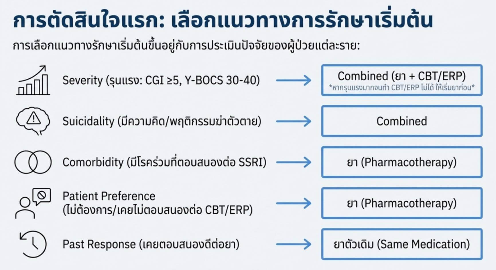 - เริ่มด้วย combined modality (CBT/ERP + ยา)