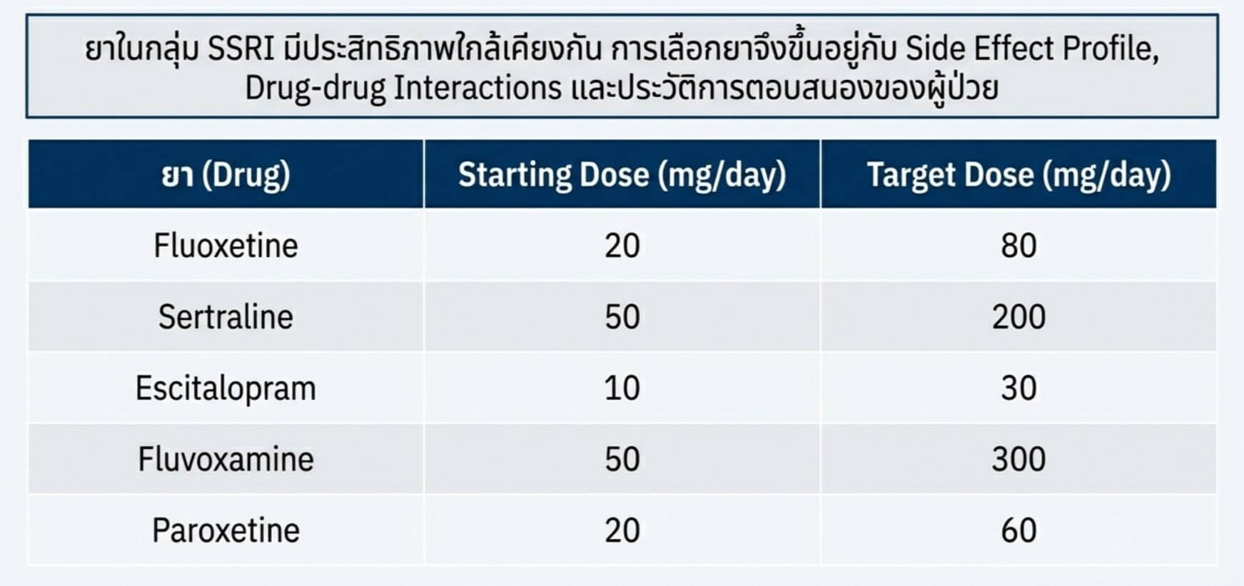ยาแต่ละตัวในกลุ่ม SSRI มี effectiveness พอๆกัน จึงเลือกยาจาก s/e profile ที่ผู้ป่วยต้องการเลี่ยง, drug-drug interactions, และประวัติเคยได้รับยาแล้วได้ผลดี