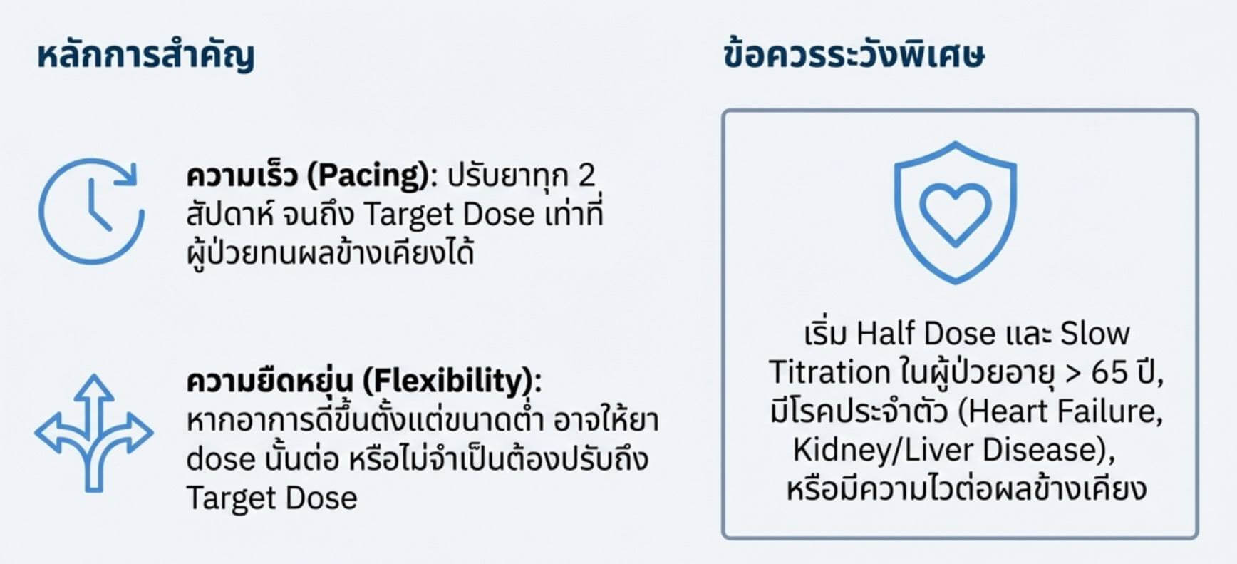 เช่น ถ้าอาการเริ่มดีขึ้นตั้งแต่ได้ขนาดต่ำ เราสามารถให้ยา dose นั้นต่อนานขึ้นได้ หรืออาจไม่ต้องปรับให้ถึง target dose