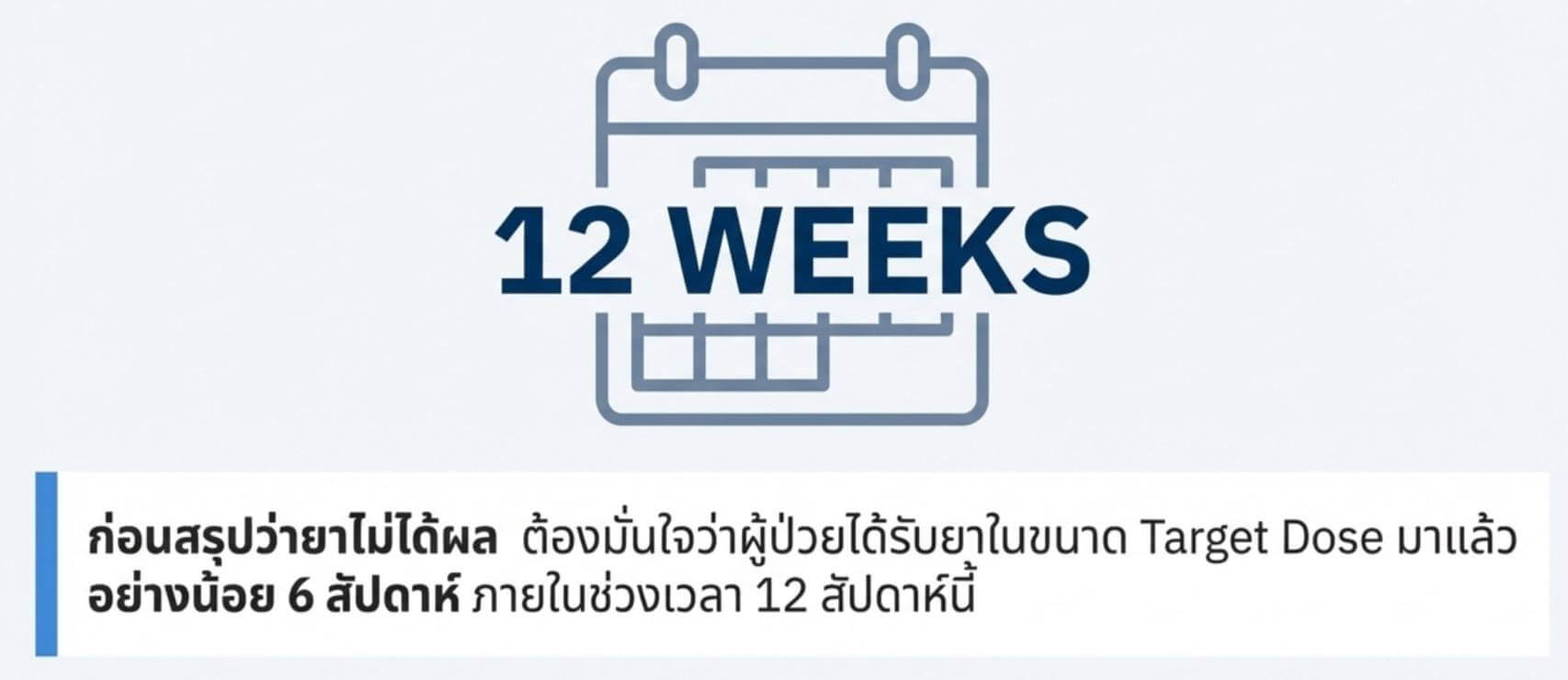 ก่อนที่จะสรุปว่ายาไม่ได้ผล หรือ ก่อนปรับเพิ่มเป็น supratherapeutic dose หรือ augment ต้องมั่นใจว่าผู้ป่วยได้รับยาถึง target dose