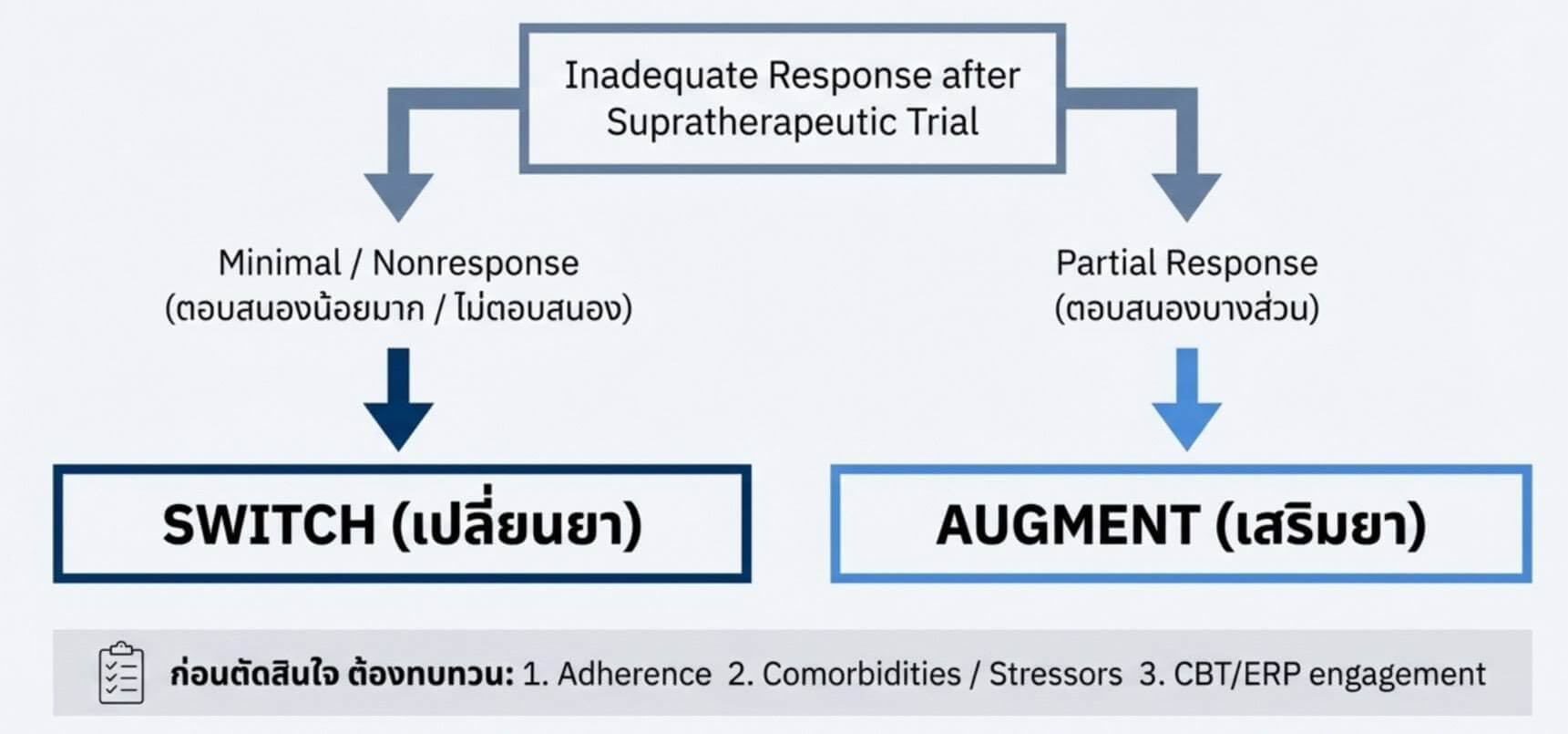 🚩 หากปรับยาถึง supratherapeutic dose หรือ augment ด้วย CBT/ERP แล้ว